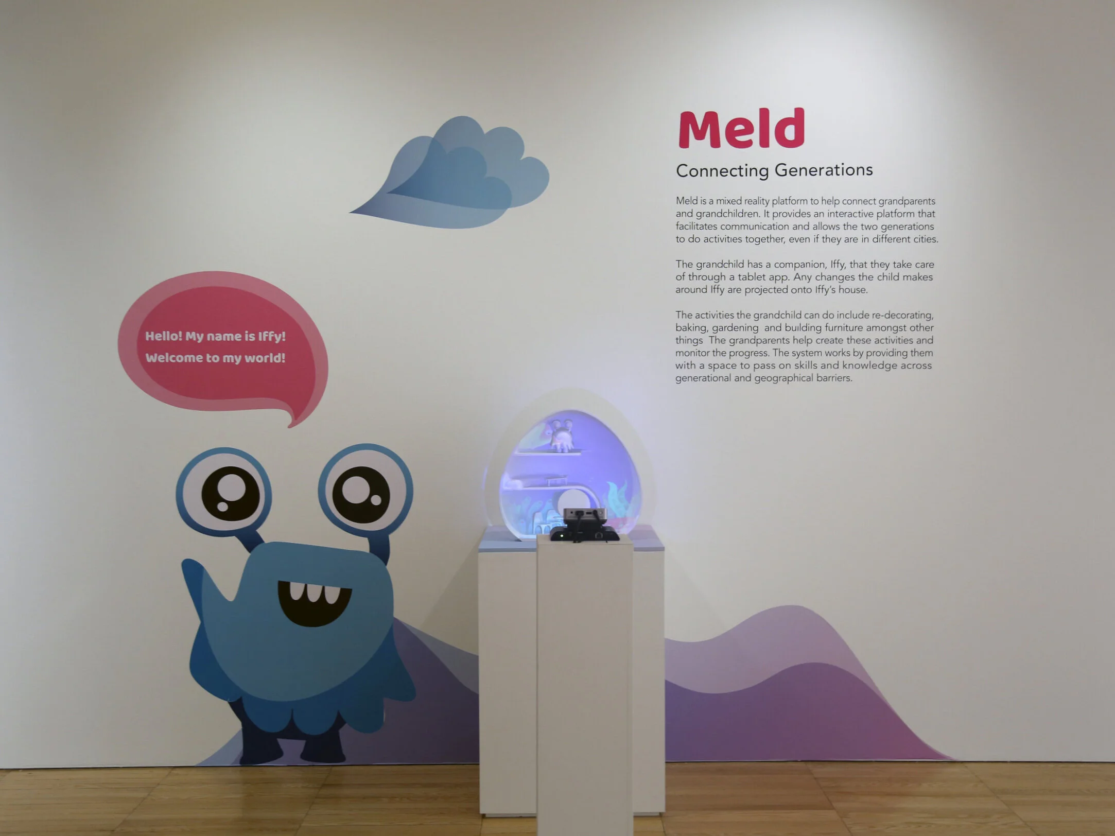 Meld is a mixed reality platform to help connect grandparents and grandchildren. The grandchild has a companion Iffy that they take care of through a tablet app. Any changes the child makes around Iffy are projected on to Iffys’ house. The activities that the grandchild can do include redecorating, baking, gardening, and building furniture amongst other things. The grandparents help create these activities and help out. The system works by breaking the structured play paradigm and creating a space for child-led play in a safe environment.